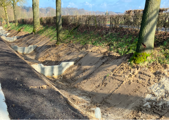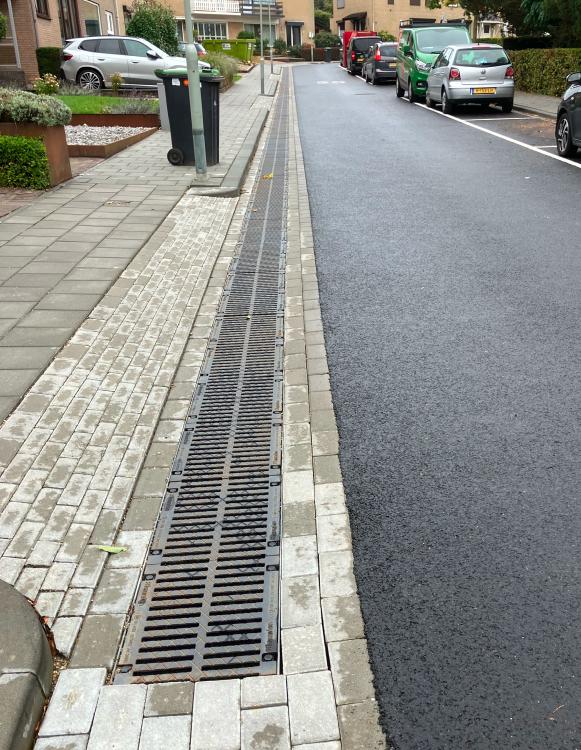 Integrale reconstructie waarbij regenwater via molgoten en lijngoten wordt afgevoerd naar een buffer.